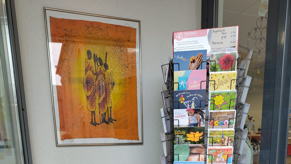 Der Eingang zum Weltladen zeigt sich jetzt noch einladender. Eine von einer Kundin gespendete Batik, die mit einem Bilderrahmen versehen…