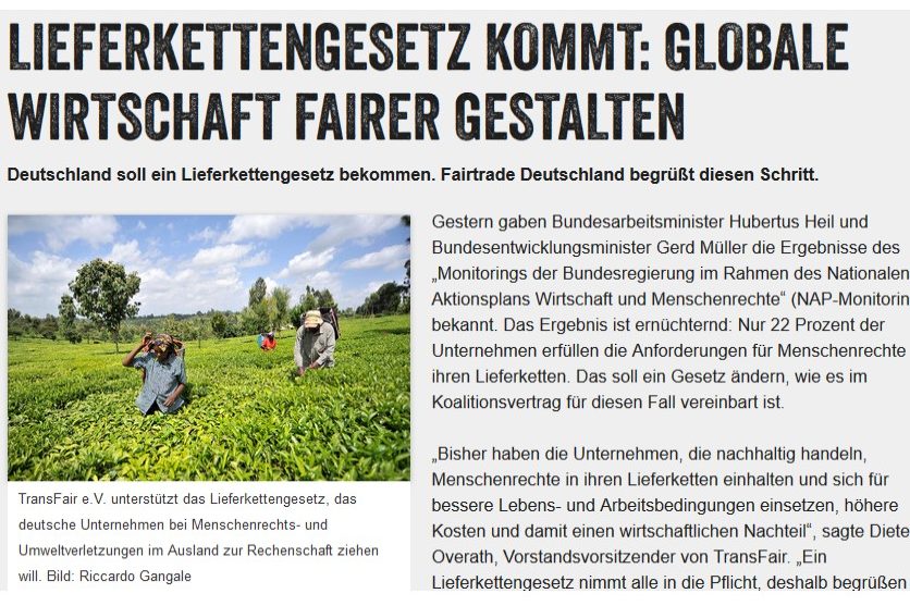 DetailsMehr Fairness durch das Lieferkettengesetz? Im neuesten Newsletter von Fairtrade-Deutschland wird das von Arbeitsminister Hubertus Heil und Entwicklungsminister Gerd Müller…