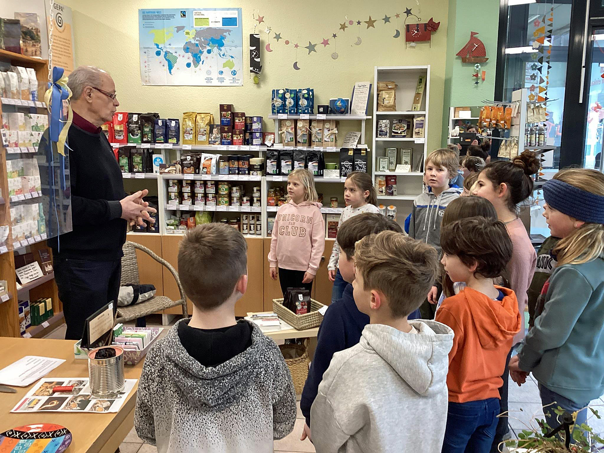 Die Michael-Grundschule zeigt wiederholt reges Interesse, mit ihren Schülern den Weltladen zu besuchen und sich über Fairtrade und faire Produkte zu informieren. Dieses Mal empfingen Bernd Röddel und Hubertus Heix Schülerinnen und Schüler der 2. Klasse. Die Neugier war groß. Besonders beim Thema Schokolade war die Aufmerksamkeit gegeben, weil dieses Produkt bei den Kindern immer beliebt ist. Die Schüler erfuhren, woher die Kakaobohne kommt, wie mühselig die Ernte ist und dass sehr häufig ausbeuterische Kinderarbeit damit verbunden ist.