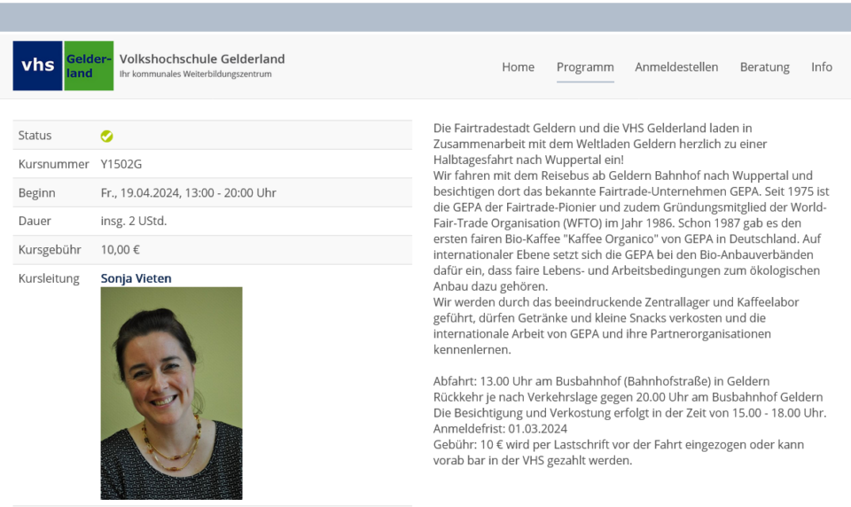 Einladung zur Halbtagesfahrt nach Wuppertal zur Gepa Die Fairtrade-Stadt Geldern und die VHS Gelderland laden gemeinsam mit…