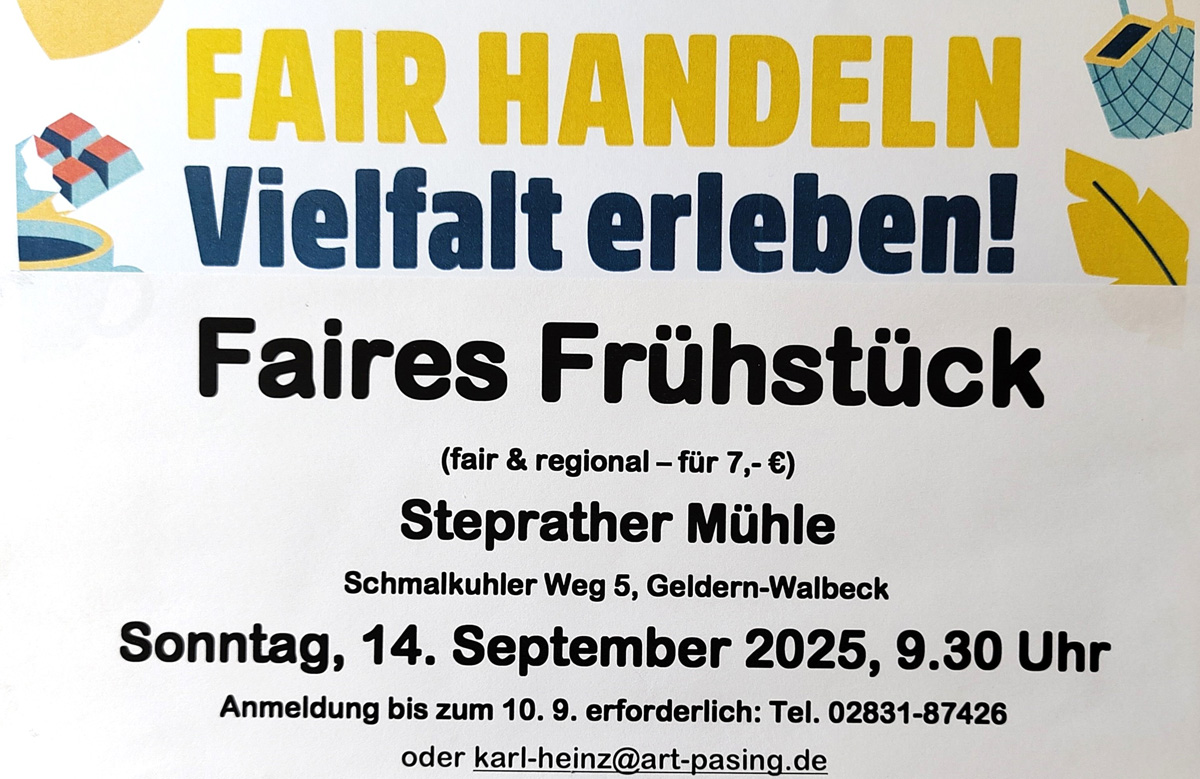 Die größte Aktionswoche des Fairen Handels in Deutschland – die „Faire Woche“ – findet in diesem Jahr vom 12. bis 26. September statt. Rund 2.000 Veranstaltungen bundesweit laden zum Mitmachen ein. Unter dem Motto „Fair handeln – Vielfalt erleben!“ machen sie deutlich, wie wichtig Vielfalt für unser Leben ist und wie der Faire Handel zu mehr Vielfalt beiträgt. In Geldern findet ein außergewöhnliches „Faires Frühstück“ an einem außergewöhnlich schönen Ort statt. Es handelt sich dabei um die älteste voll funktionsfähige Turmwindmühle Deutschlands, die Steprather Mühle am Schmalkuhler Weg 5 in Geldern-Walbeck. Wer entspannt mit einem fairen und regionalen Frühstück den Kommunalwahltag am Sonntag, 14. September um 9.30 Uhr beginnen will, der sollte sich rechtzeitig dazu anmelden rät die Veranstaltergemeinschaft Fairtrade-Stadt Geldern, Weltladen Geldern und Förderverein Steprather Mühle Walbeck e.V.