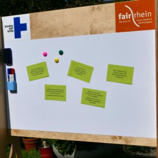 Die Tafel mit Seitenständern mit den Plättchen zum Thema Kinderarbeit, Stifte und einige Magnete sind in Kamp-Lintfort ausleihbar.