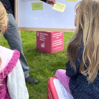 Die Tafel kann kindgerecht mit Sitzplätzen auf den SDG-Würfeln oder auch höher (stehend für Erwachsene) aufgebaut werden.