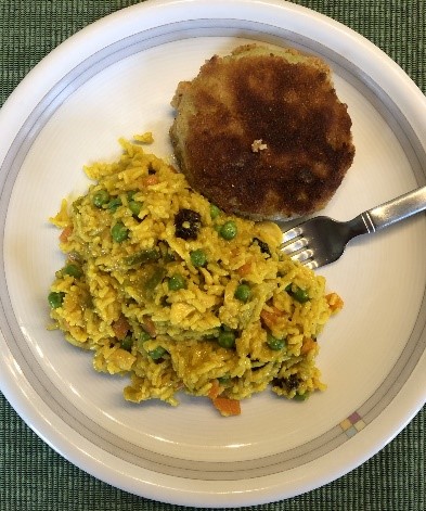 Möhre klein würfeln. Lauchzwiebeln in kleine Scheiben schneiden. Das Olivenöl in einem Topf erhitzen und Möhren und Lauchzwiebeln, den Reis, die Rosinen und Cashew-Bruch unter Rühren kurz anrösten. Mit Koriander, Kurkuma und Harissa würzen und mit dem Wasser auffüllen. 10 Minuten köcheln lassen, dabei immer mal wieder umrühren. Erbsen dazu geben. Mit Salz und Pfeffer abschmecken. Falls das Pilav zu trocken ist, etwas Olivenöl dazu geben. Danach noch 10 Minuten ziehen lassen.
